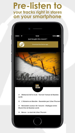Revive allows you to once again, offer music as a special gift to those you love. It is the new social bond for those who love music, performers, beautiful covers, quality sound, and creating memories around a vintage product. No more problems with record player hardware, simply hold your smartphone, tablet or NFC-equipped device near the vinyl record and let the magic happen. Listen while browsing a universe available from your favorite artists, including exclusive messages, artists’ latest social network posts, dates of upcoming concerts, clips and lyrics of your most cherished songs...