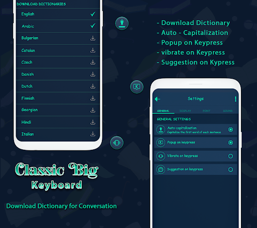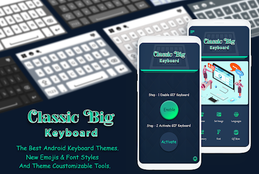 Classic Big keyboard is the best Android keyboard with up-to-date Keyboard App Classic Big keyboard background, custom keyboard, word prediction and swipe typing. Keyboard fonts supports emoji & emoticons like throwing up, wizard, giraffe, and tons more new fonts, emojis, GIFs & emoticons .