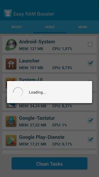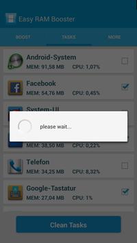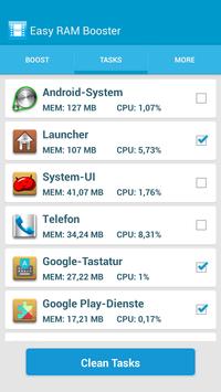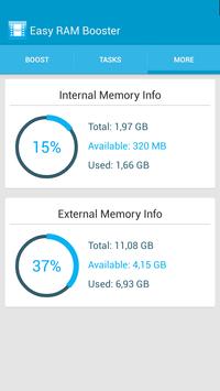 You can boost your RAM with single touch. Touch boost button and clear running process. In Tasks tab you can swipe to clean individual process from ram memory. In more tab you also know about your internal and external memory status.