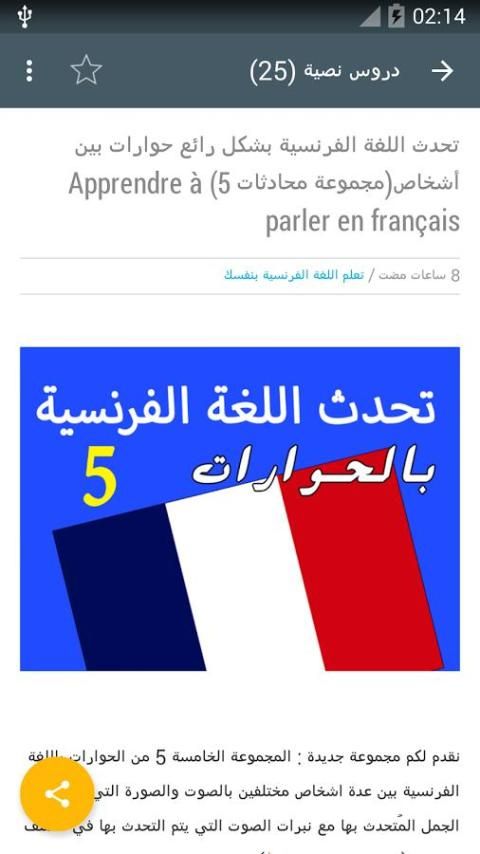And more offer you all the lessons presented on the network to learn French yourself by professors specialized in the French education and all the lessons written and video audio and video programs and stories translated, movies and tutorials for beginners, intermediate, books, software and everything on a single application you can download size does not exceed 8 MB + lessons will be loaded automatically text size 1 MB only please to obtain this modest satisfaction work do not forget the good prayers.