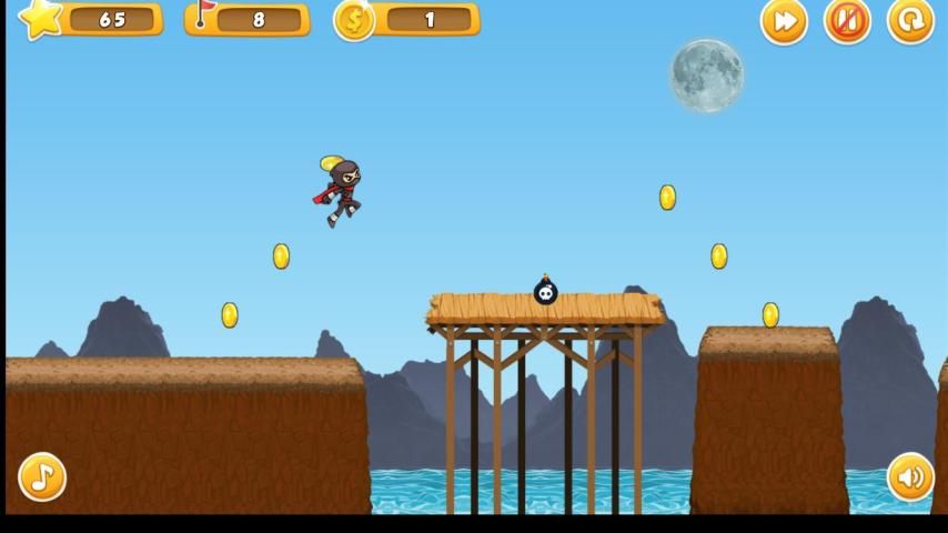 Ninja Run - é um jogo incrível e legal no qual você joga como um ninja que estabeleceu um objetivo para ser muito íngreme e coletar o máximo possível de moedas, ouro e jóias. Quanto você poderá correr? Tenha cuidado porque no seu caminho haverá saltos perigosos, espinhos e bombas. Prove que você é o melhor ninja!