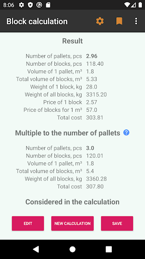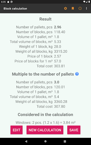 *Multiple to the number of pallets - in this calculation, the program rounds the number of pallets to an integer and makes an alternative calculation based on this. Usually this calculation is necessary when you buy blocks from the factory, when it is not possible to buy building blocks separately.
