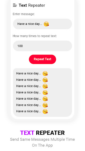– Text Repeater: You can send repeated texts with added space, next line and other characters, then you can generate the message you want to send and how many times you want to send. You can send one message up to 999 times.