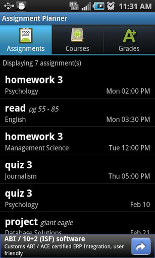 Never miss a due date again! Keep track of assignments, homework, projects, courses, classes and grades. Sort assignments by due date or course, set reminders to notify you when a due date is near, then mark them completed when you’re finished. Keep track of grades and your GPA! Simply the most intuitive and user friendly Assignment Planner on the market! Become the stellar student you always wanted to be.