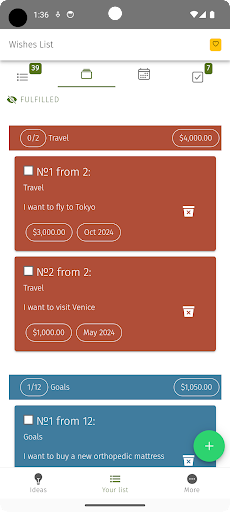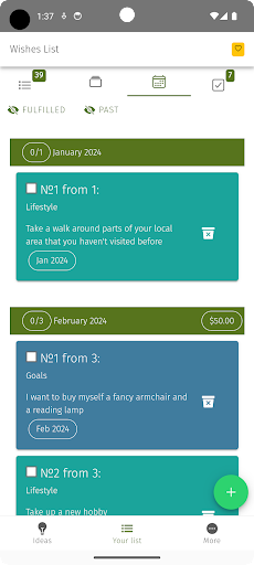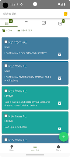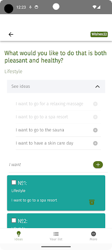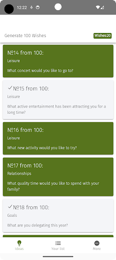 I know how hard it is to write 100 wishes out of head, so I created this app. In it you will find 100 questions from various spheres of life. Try to think about the question and write your desire. For inspiration, you can click on the "See Ideas" button.