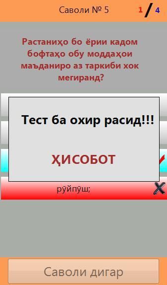 Шакли навтарини барномаи тестии География-2017. Имкониятҳои нав, функсияҳои нав ва саволҳои нав. Аз ҷумла: Маводҳои иловагӣ, дидани ҷавобҳо, баровардани ҷавобҳо дар охир ё дар аввал ва ғайраҳо....Марҳамат гиред ва ҳаловат баред. Дар шакли нопурра барнома қисман кушодааст. Шумо дар баробари харид намудани шакли пурраи онро бо нархи ҳамагӣ 1 сомонӣ ҳам барои дониши худатон ва ҳам барои ривоҷу равнақи барнома саҳми худро мегузаронед.