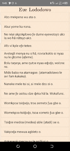Ewe proverb app consist of proverbs in Ewe and their literal meaning in English to help those who cannot understand the Ewe dialiet and it also provide the users with some riddles in Ewe.