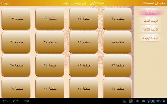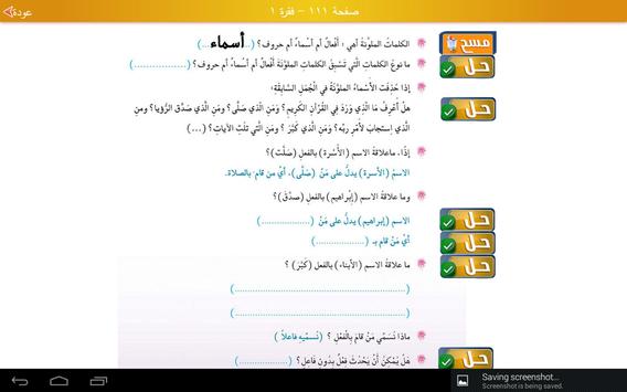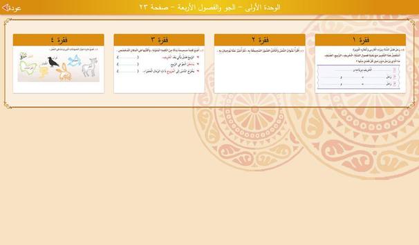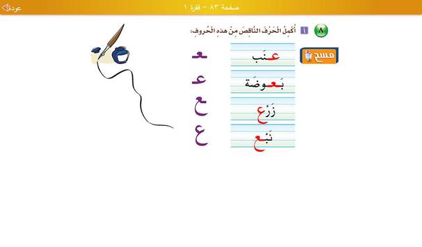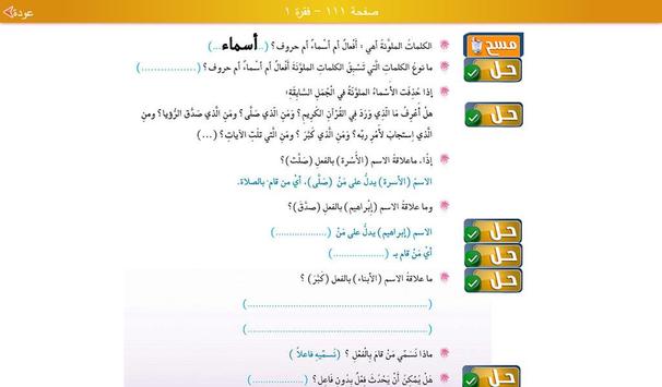 يختار الطالب الوحدة ثم يختار رقم الصفحة فيتم عرض فقرات الصفحة وباختيار الفقرة تظهر الفقرة في صفحة لوحدها بحيث يركز عليها الطالب مع أزار الحل والمسح والتي تتيح للطالب حل التمرين ومسحه لكي يقوم هو بالحل.