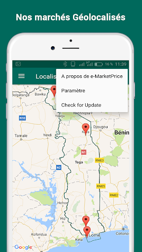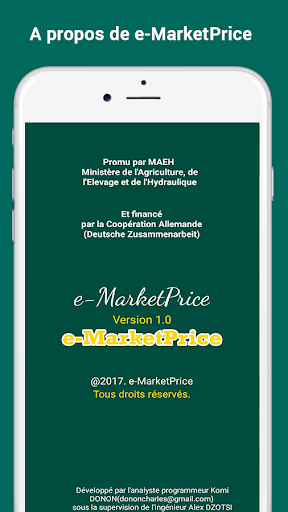 Promoted by the Ministry of Agriculture, Livestock and Fisheries (MAEP) of Togo and funded by the German Cooperation (Deutsche Zusammenarbeit-GIZ), the application "e-MarketPrice" is a 100% Togolese application simple and intuitive, allowing any natural or legal person from the formal and informal sector to consult and analyze the prices of products available on Togolese markets.
