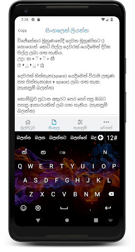 Sinhala Keyboard app will integrate the keyboard into the Android operating system so you will have access to the keyboard from any application.