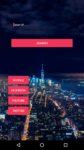 Home screen displays beautiful night skyline with search option at the top.