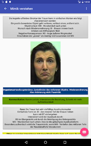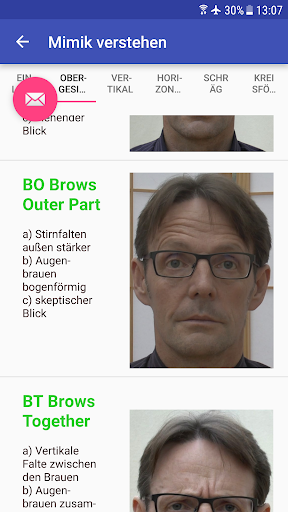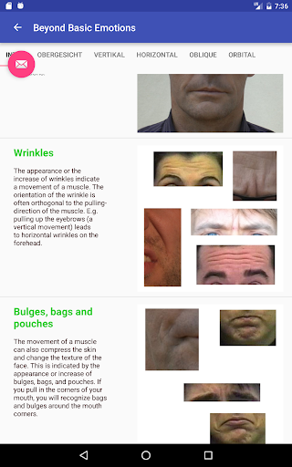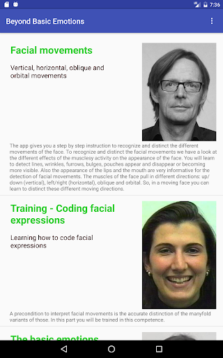 In this part of the app you will learn to understand what the different components of a facial expression mean. As result you will be able do distinct different variations of the same basic emotion e.g. "cold" from "hot" anger.