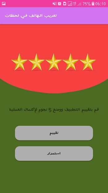 مع تطبيق تعريب الهاتف بدون روت تستطيع تعريب الجهاز الى اللغة العربية بالكامل يمكنك التطبيق تعريب أيضاً من إختيار نوع الأرقام التي تود تفعيلها مع اللغة العربية أرقام عربية أو انجليزية و القضاء على المشكل الدي كنت تعاني منها. يقوم التطبيق تعريب الهاتف بدون روت الى اللغة العربية و يسهل عليك التطبيق عملية تعريب الجهاز بضغطة زر واحدة فقط سوف يمكنك تطبيق تعريب الجهاز في انهاء مشكلتك بالكامل.