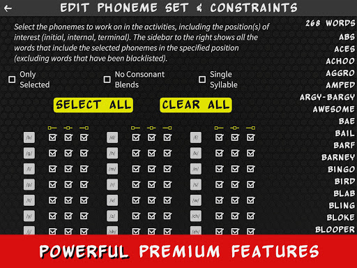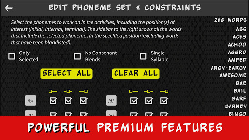 Extra Goodies like novelty voices, different colour schemes and sound effects can be unlocked with points earned training. Because even older students like funny voices! Or get the Upgrade to Premium to unlock all the Goodies, remove ads (a short video every 15 exercises) and control which phonemes to focus on in the Phoneme Set Editor.