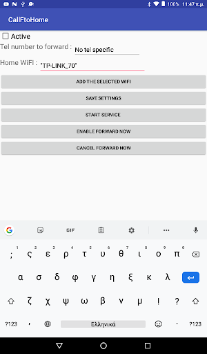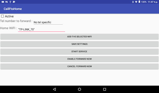 usage : Enter the phone number you would like to forward all your calls and enter the selected WiFi network when you are connected to activate the call forward.