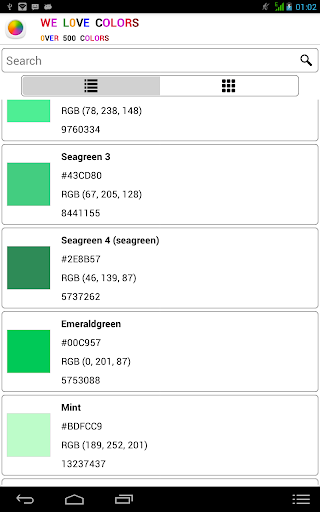 Over 500 colors with their respective names, hex code, RGB value and Microsoft Access Code Number.