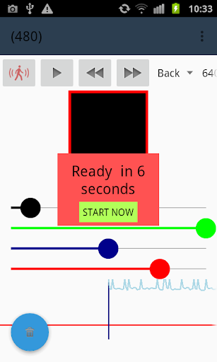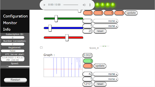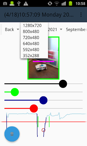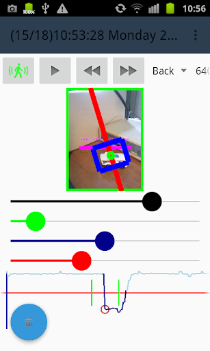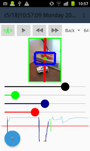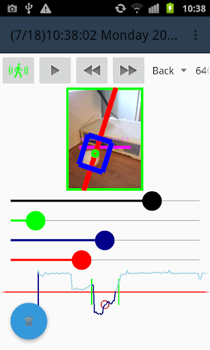 The motion detection algorithm is easily tunable thank to a real time graphics which display the detector response. Tuning of the detector is simply done with four spinners. The red spinner is allowing to setup the minimum value for triggering an alarm event. The blue spinner is scaling the amplitude of the curve. The green spinner is filtering the events (according to width) which will produce an alarm. The black spinner is smothering the sensor value. Spinner can be locked and unlocked with long press.