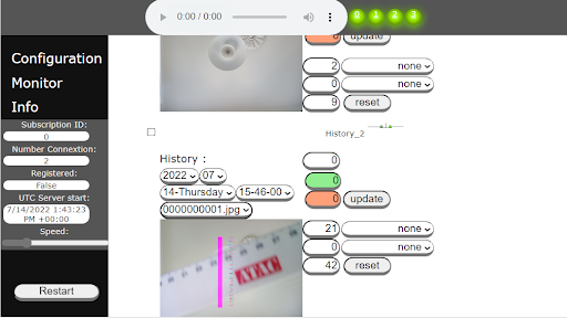 During the replay mode (green border) the entire recorded images event can be reviewed. The recorded events are classified respectively by production year, month, day and time. They are directly accessible with the four drop down menu bar in the menu panel. To navigate quickly to the previous or next recorded events just scroll down or up the video view. To navigate quickly to the previous or next frame just scroll left or right the video view. The real time graphics can as well be scrolled in order to quickly navigate through all the currents displayed events. The application has also incorporated the classical button “play”, “rewind” and “forward”.