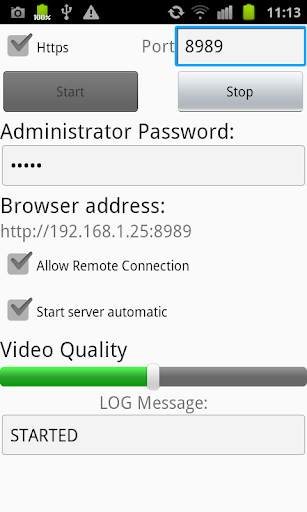 When the phone is connected to a Wi-Fi router, video and alarm signal of the mobile phone can be monitored on any browser at a remote location. The connection is secure with username and password being respectively “root” and “admin”. The password should be changed and can be displayed with a long press on the title “Administrator Password”. Old video sequence can be reviewed and deleted as well. The monitor web pages will enable to create its own alarm.