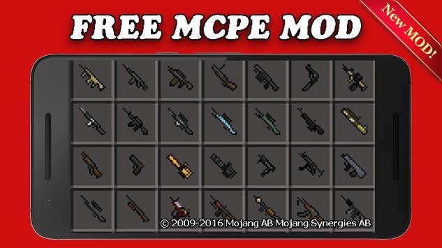 All weapons you can do yourself in survival mode, all crafting recipes are shown below. But you can find dozens of weapons in the creative MCPE mode inventory, but not in full. Guns Mod for Minecraft adds Guns, Explosions and more than 50 weapons to mcpe.