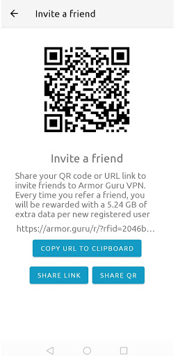 When you share Armor Guru VPN with friends you get extra free data as a reward. At registration you get your own referral QR code. When your friends register through the QR code you are a rewarded with extra data.