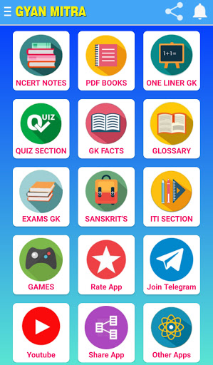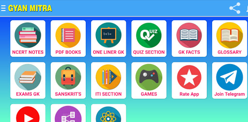 GYAN MITRA : Learning App (ज्ञान मित्र ऐप) contains NCERT Notes, NCERT All Classes PDF Books, One Liner GK, General Knowledge, Current Affairs, Maths, Reasoning, English Vocabulary, English Grammar, World GK, India GK, Various States GK include Rajasthan GK, History, Science, Geography, Hindi Grammar and Computer Awareness with 20000 Online Tests (Quiz Section), Various Subjects Dictionary (Glossary), ITI Trade Notes and some Brain Games.