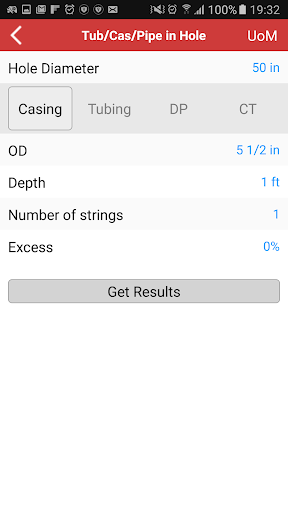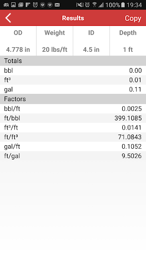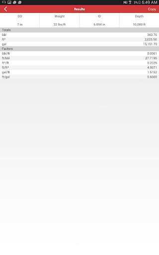 • Calculate volume per depth in multiple units (barrels per foot, gallons per foot, liters per meter, and more)