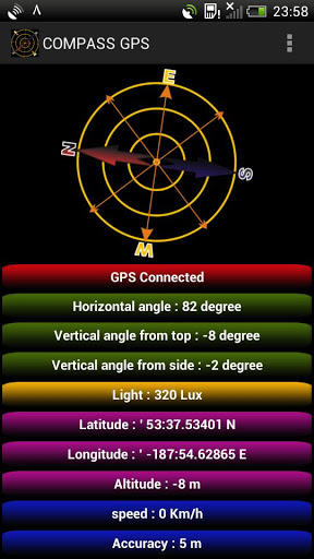 with this very small app , you will have a compass and a gps on your phone that shows you : - compass - altitude - latitude - longitude - speed - accuracy - light lux - gps connection status its free just download it and see how useful it is