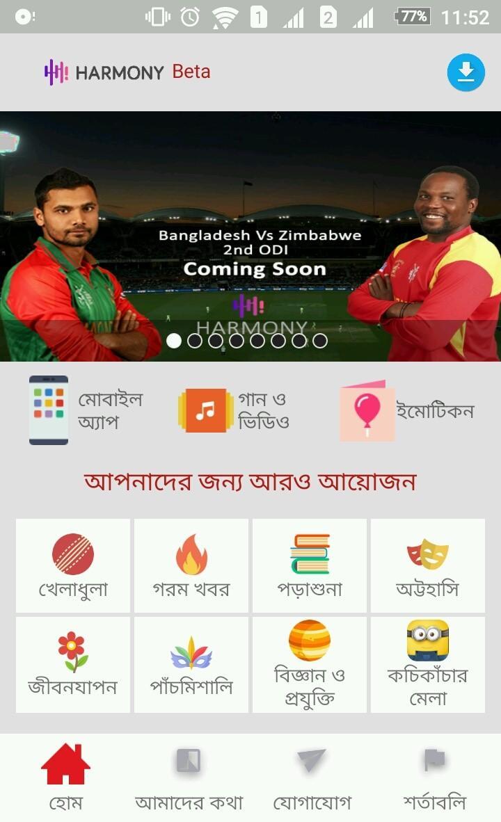 হারমনি অ্যাপ, যেখানে রয়েছে নিত্যদিনের কাজের জন্য প্রয়োজনীয় সকল অ্যাপ যা এই অ্যাপ থেকে সহজেই ডাউনলোড করা যাবে। পাশাপাশি সারাদেশে কোথায় কি হচ্ছে, সকল খবরা খবর, ফুটবল, ক্রিকেট সহ বিভিন্ন খেলার খবর, অসাধারন সব গান আর ভিডিও, পরিবার ও প্রিয়জনের জন্য ইমোটিকন , শিশু ও কিশোর কিশোরীদের জন্য মজার সব গল্প সহ আরও অনেক কিছু জানতে আজই ডাউনলোড করুন হারমনি অ্যাপ।