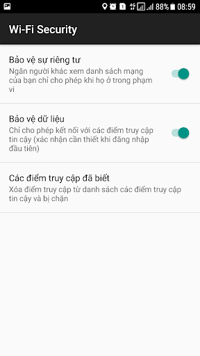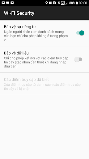 1. Wi-Fi Security ngăn không cho điện thoại thông minh của bạn gửi ra tên của mạng Wi-Fi mà chúng muốn kết nối qua vô tuyến. Điều này sẽ đảm bảo những người khác trong môi trường xung quanh bạn không thể nhìn thấy các mạng bạn đã kết nối và những nơi mà bạn đã truy cập.
