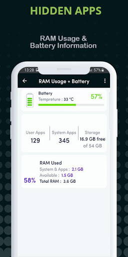 - information about RAM usage and battery status. (Ram available, free and total ram)