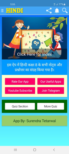 App contains solutions of all chapters of NCERT Hindi for class 8. It contains some sample questions papers and chapter wise question answers also. This app has a very simple user interface.