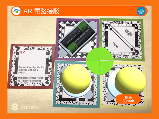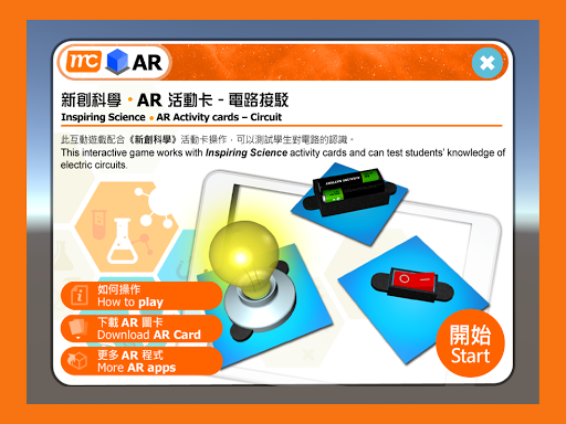 此互動程式配合新創科學® 的活動卡運作,可用來測試學生對電路的認識。把流動裝置的鏡頭對準問題卡及相關的電路元件卡時,程式便會顯示出對應的電路立體模型在屏幕上。電路元件卡需按照特定的方式排列,電路的立體模型方能在屏幕上顯示出來。