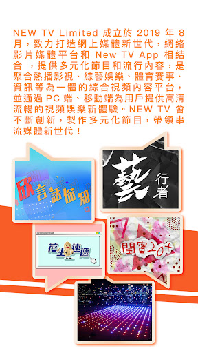 觀眾透過NEW TV App隨時隨地觀看人氣節目,甚至與節目及其他觀眾互動,介面簡潔、高清畫質,盡享前所未有的觀看體驗!