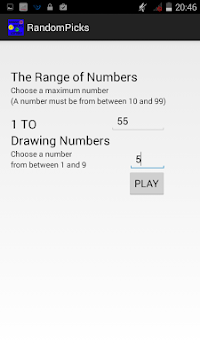 Finally, you press a "PLAY" button. This app will pick number(s) randomly for you. In this case, there are 5 numbers drawn from numbers between 1 and 55.