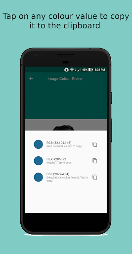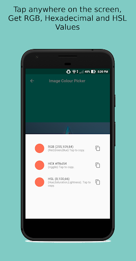 Color Picker tool for photos. Load any photo on your phone, tap anywhere on the image and get the RBG, Hexadecimal, or HSL color codes of that point. Tap the code and it gets copied to the clipboard. Useful for web development, Image editing or just when you want to find out the color of a part of a photo.