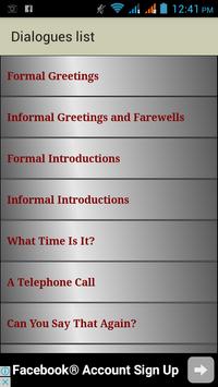 A cover page screen will display for 3 seconds. This screen will close automatically after 3 seconds. Then a list of dialogues will in front of you . When you will click any dialogue tilt. A new screen with complete dialogue will open. then you can read and learn the daily English conversation. In the next version of the application we will add more information about daily English conversation. So keep engage with us for new version. Share this application with your friends. Thanx