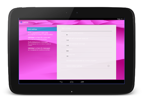 The count unit can be set up(eg. 60 s taking a minute-based tariff), along with the default call price.