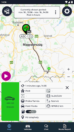 INTERACTIVE MAP VIEW. Through the map view of the app, you can display the current location of vehicles in your fleet or just the vehicles selected by the user with a single click. The map allows you to check the routes taken up to 24 hours back. The data of a given vehicle can be displayed in the map view with a single click.
