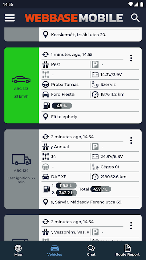 VEHICLE INFORMATION. The app displays key information about the vehicles connected to the system in a clear and searchable way: valid vignettes of the vehicles, vehicle parking information, driver names, battery charge, current route type, odometer readings, fuel levels and last known location of the vehicles.