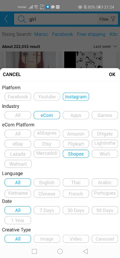 Whole network search: Search global advertising ideas on all platforms, and you can filter content in multiple dimensions such as SortBy, Page Categories, Language, CTA Types, Creatives, Device Types, Dates, etc.
