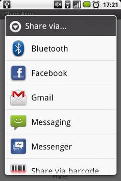 It provides a number of methods for you to share the app to your friends such as Bluetooth, Facebook, SMS Messaging, Barcode, WhatsApp, Email, Gmail, etc.(Some methods may need to install a related application)