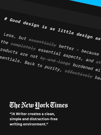 “iA Writer creates a clean, simple and distraction-free writing environment for when you really need to focus.” ***** The New York Times