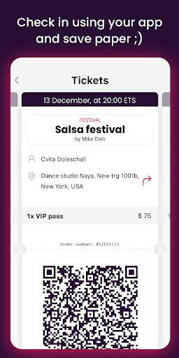 Easily verify tickets by using the iDanceSocial generated QR barcodes and a separate iDS organizer app for scanning of tickets