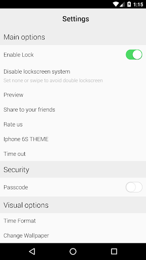 The lock screen for iFan, ★ Time out ★ Password ★ Time Format ★ Change Wallpaper ★ Change Unlock Text ★ Sound and Vibrate