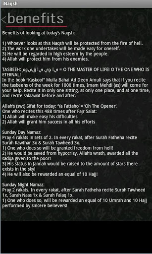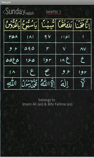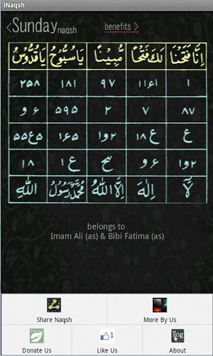 A phone is probably the first thing that you see in the morning. We have made this app keeping this in our mind so that one can start the day with the blessings of Allah and Ahlulbayt by looking at the Naqsh of the day which this app automatically displays. Each day belongs to Masoomeen. This app will tell you all the details and what you should do that day with suggested Duas and Namaz. You can share the Naqsh to your friends and familiies through Social media or the messaging.