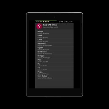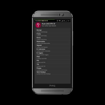 Kuis Ujian SMA adalah game pendidikan yang dikhususkan bagi siswa siswi sekolah menengah atas (SMA) untuk melatih kemampuan berfikir dan mengasah pengetahuan tentang pelajaran-pelajaran yang ada di sekolah. banyak sekali matapelajaran yang ada dalam game ini yaitu Bahasa Indonesia, Matematika, Kewarganegaraan, Ilmu pengetahuan alam, ilmu pengetahuan sosial, Bahasa Inggris, Pendidikan Agama Islam, Kesenian, sosiologi, geografi, sejarah, kimia, fisika, ekonomi, biologi dan lainnya.