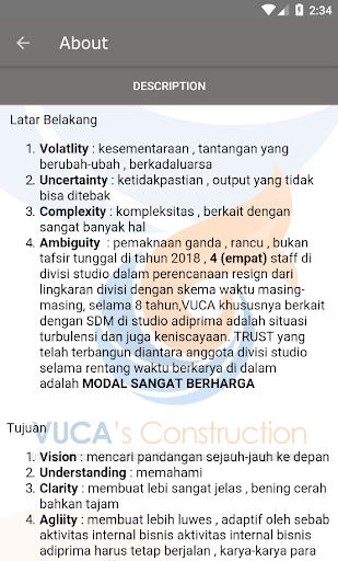 ambiguty : pemaknaan ganda, rancu, bukan tafsir tunggal di tahun 2018, 4 (empat)staff di divisi studio dalam rencana resign dari lingkaran divisi dengan skema waktu masing-masing. selama 8 tahun,VUCA khsusnya berkait dengan ASM di studio adiprima adalah situasi turbulensi dan juga keniscayaan, TRUST yang telah terbangun diantara anggota divisi studio selama rentang waktu berkarya di dalam adalah MODAL YANG SANGAT BERHARGA