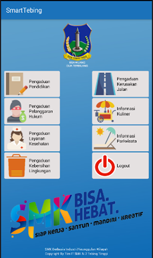 Aplikasi Smart City Kota Tebing Tinggi yang dinamakan dengan "SmartTebing" merupakan Aplikasi yang didesain untuk menampilkan informasi pariwisata dan kuliner yang terdapat di Kota Tebing Tinggi.