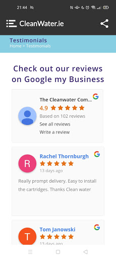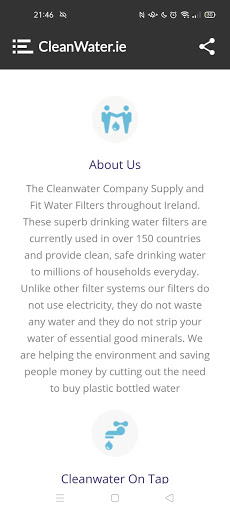 The Cleanwater Company Supply and Fit Water Filters throughout Ireland. These superb drinking water filters are currently used in over 150 countries and provide clean, safe drinking water to millions of households everyday. Unlike other filter systems our filters do not use electricity, they do not waste any water and they do not strip your water of essential good minerals. We are helping the environment and saving people money by cutting out the need to buy plastic bottled water